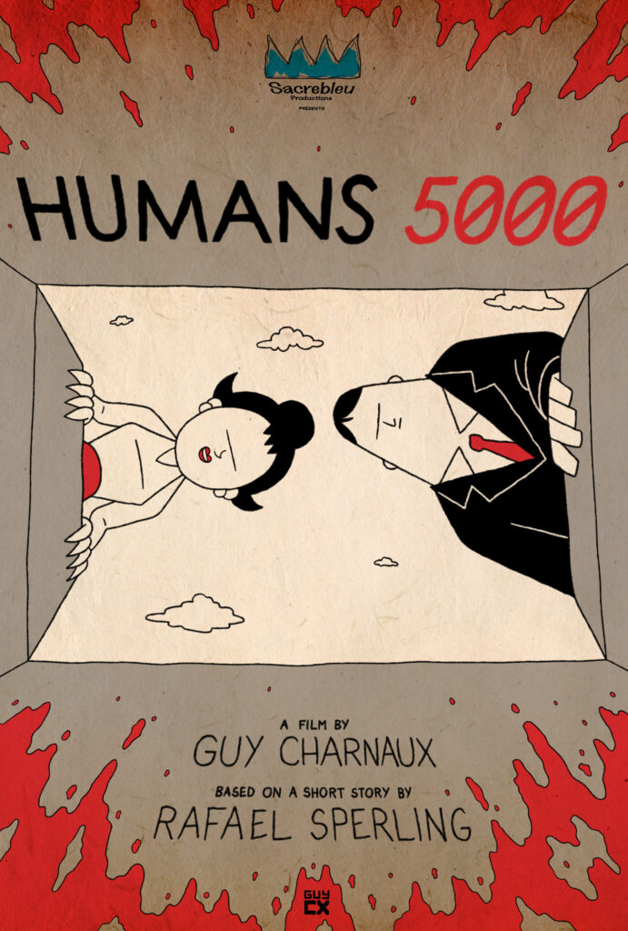 Humans 5000 Animation 2D - 6' Réalisateur : Guy CHARNAUX Scénaristes: Guy CHARNAUX & Rafael SPERLING Compositeur: Rafael SPERLING Production: Sacrebleu & Guy CHARNAUXDans un monde où les proches se commandent dans des boîtes, les choses tournent très mal pour cette famille. Fiche technique